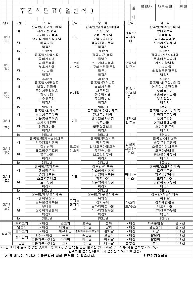 2025년 08월 11일 ~ 2025년 08월 17일 식단표 페이지 정보 관리자2 354회 등록일2025.08.11 관련링크 본문 8월 2주 식단표 이전글2025년 08월 18일 ~ 2025년 08월 24일 식단표 다음글2025년 08월 04일 ~ 2025년 08월 10일 식단표 목록